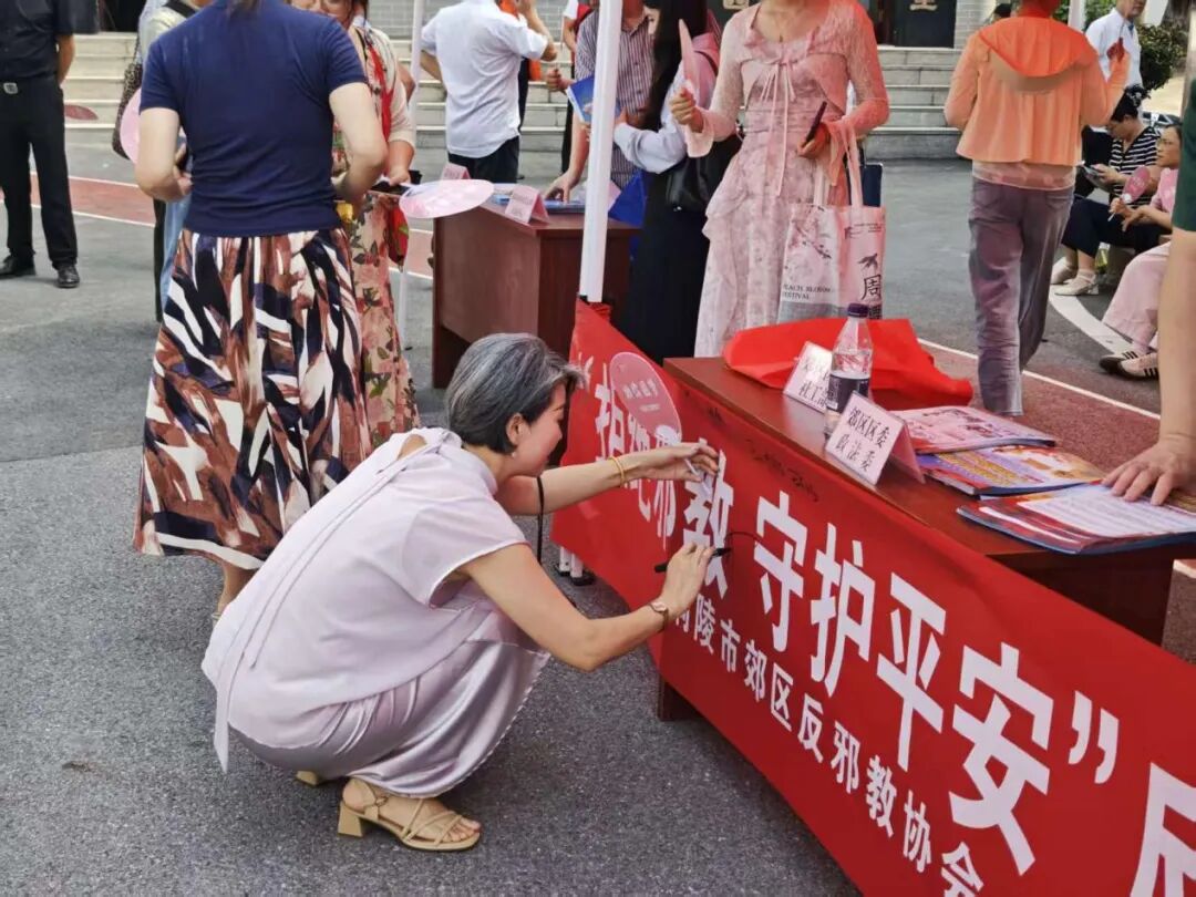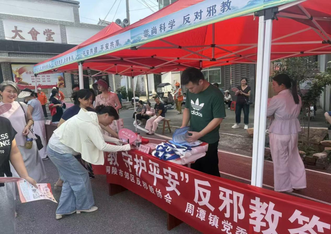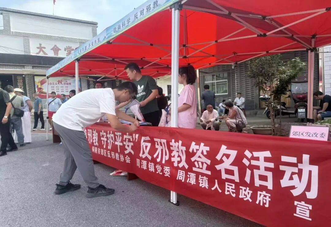 9月19日上午,铜陵市郊区反邪教协会联合周潭镇人民政府,以“文明集市”活动为契机,开展反邪教宣传“进农村”活动,旨在进一步筑牢基层反邪教防线,增强人民群众反邪教意识和法治观念,营造“全民反邪、守护平安”的社会氛围。 活动中,工作人员通过悬挂横幅、发放反邪教宣传单页、面对面讲解身边事例等方式,向群众详细讲解与反邪教相关的法律法规,阐释邪教的本质和危害以及抵御防范邪教的知识。在听完工作人员的讲解后,居民群众们纷纷主动的在“拒绝邪教、守护平安”的反邪教签名活动的横幅上签上自己的姓名,并庄重承诺,将以反邪教为己任,以签名为约定,拒绝邪教,从我做起!通过实际行动来表达对反邪教工作的支持和对邪教说“不”的决心,形成了浓厚的反邪教宣传氛围。 拒绝邪教、从我做起,我们一直在行动!守护平安郊区,提升全民反邪意识,确保反邪从我做起。下一步,郊区反邪教协会将依托网格化管理,进一步筑牢反邪教防线,共同构建平安和谐美好郊区。