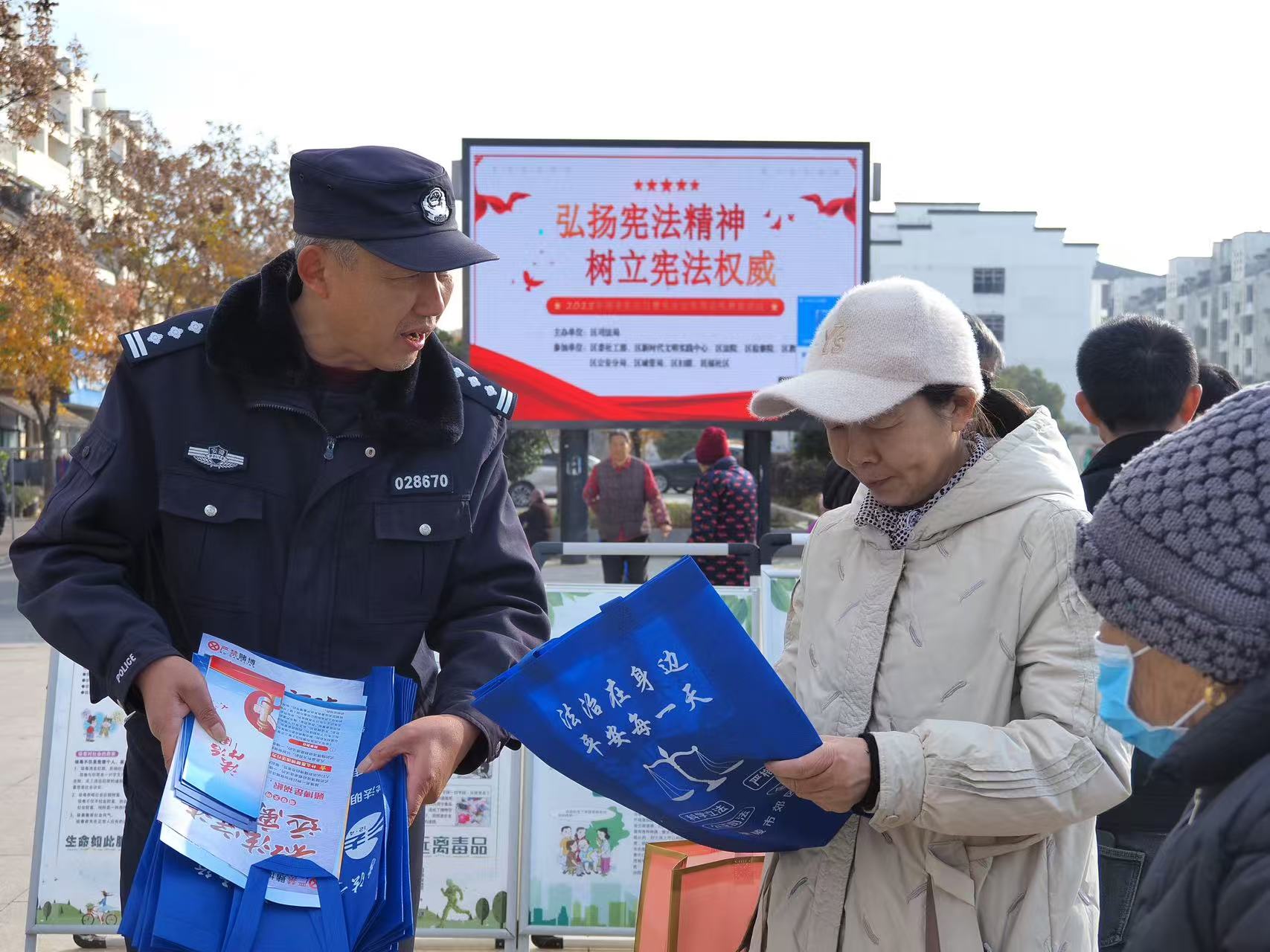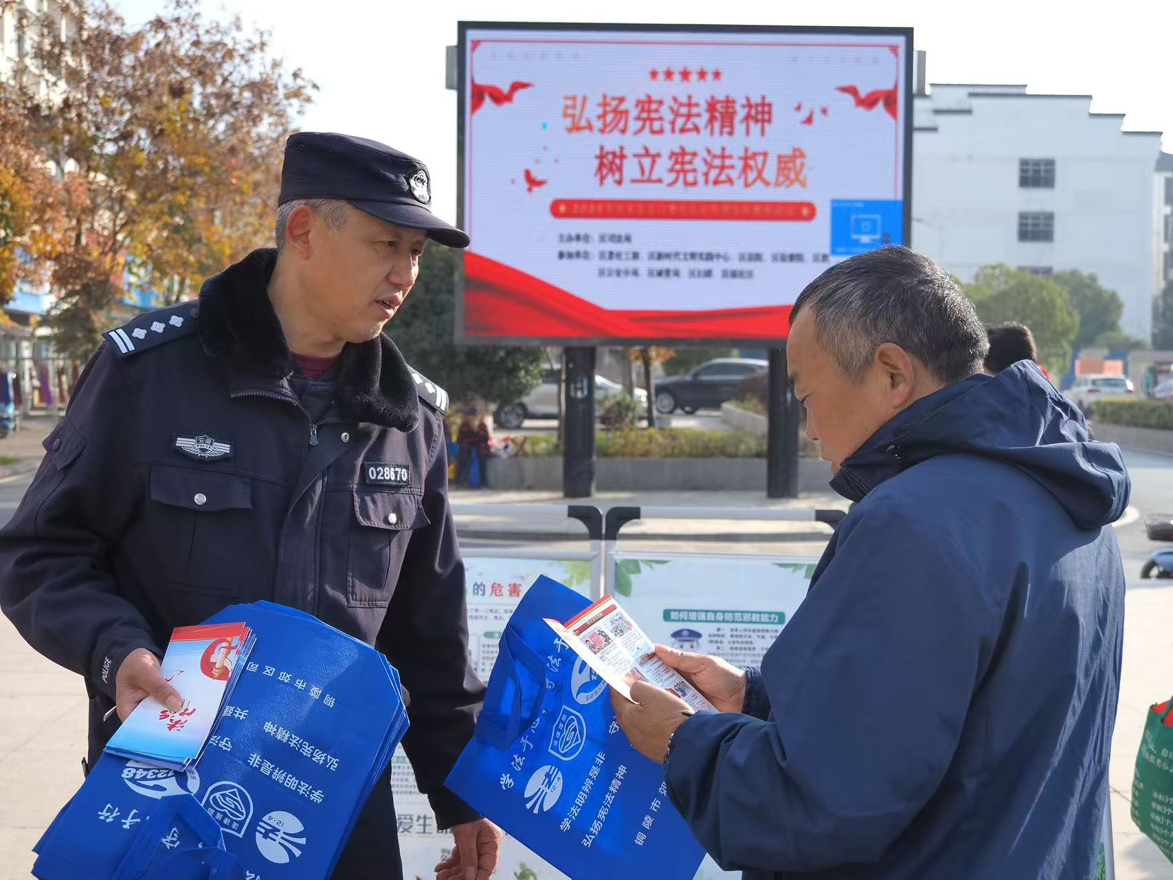 近日,铜陵市公安局郊区分局大通派出所组织民警走进社区广场,开展“国家宪法日”主题宣传活动。民警通过面对面讲解、发放资料等方式,向群众普及宪法知识与相关法律法规,引导大家自觉尊法学法、守法用法,共同营造良好的法治氛围。