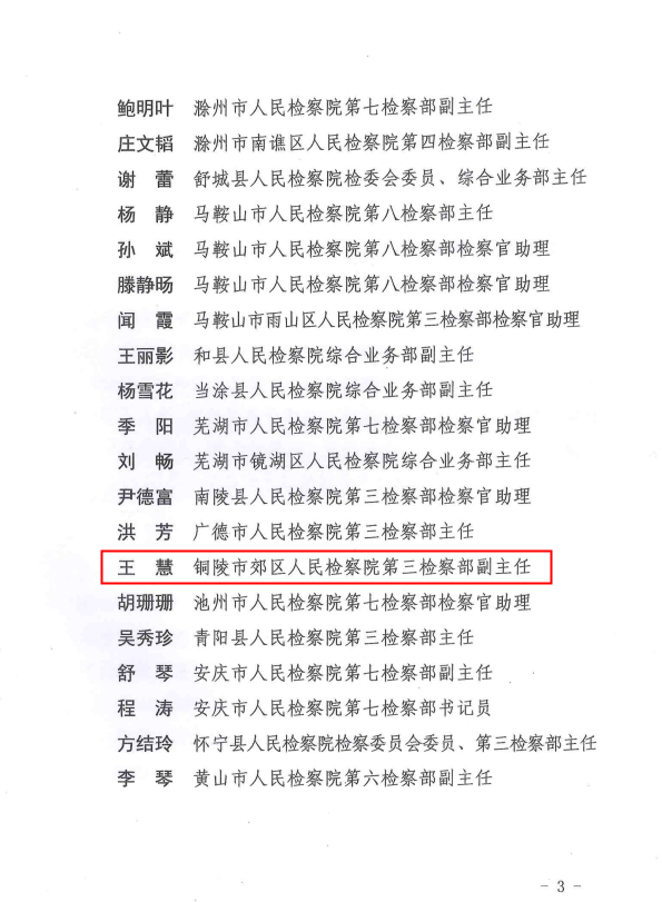 1月19日,安徽省人民检察院案件管理办公室发布了《关于建立全省检察机关案件管理人才库的通知》。其中,我院第三检察部副主任王慧入选安徽省检察机关案件管理人才库成员。